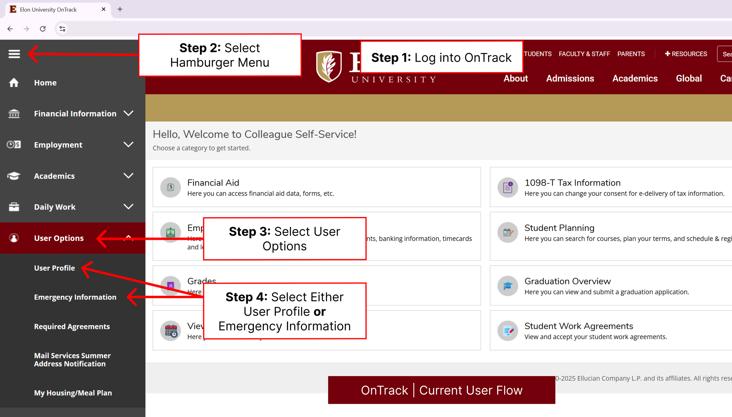 Currently, student contact information is split between two different screens in OnTrack, Elon’s student self-service portal. Information such as phone numbers, address, and personal identifiers is listed under ‘User Profile’ while emergency contact information is listed under ‘Emergency Information.