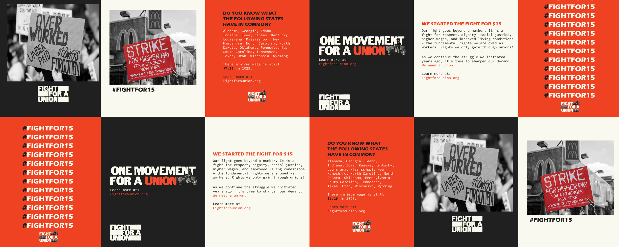 In 2012, fast food workers went on strike to demand high wages. Today, Fight For A Union has secured wage increases and benefits for U.S. workers totaling over 150 billion dollars. For this campaign, I created a series of posts focused on educating viewers with quick facts and bold images.